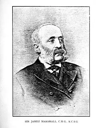 Sir James Marsall, né le à Édimbourg (Écosse), décédé près de Londres le , a pratiqué plusieurs professions durant sa vie : pasteur de l’Église anglicane (de 1852 à 1857), membre de la communauté des Oblats de Saint Charles (de 1857 à 1859), précepteur dans une famille (de 1859 à 1861), enseignant à l’école de l’Oratoire à Egbaston, près de Birmingham (de 1861 à 1866), étudiant en droit, puis avocat à Manchester (de 1866 à 1873), juge dans les colonies anglaises de Gold Coast (futur Ghana) et de la Côte de Benin (futur Nigeria) (de 1873 à 1882), et enfin retraité en Grande-Bretagne, ce qui ne l’empêchera pas de faire un nouveau séjour de trois mois à Asaba (État du Delta), pour y lancer des structures judiciaires pour le compte de la Royal Niger Company (en 1888).