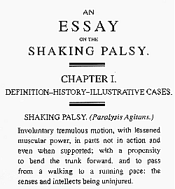 Dans son Essay on Shaking Palsy paru à Londres en 1817, James Parkinson a été le premier à publier une description claire et détaillée de six patients présentant les symptômes de la maladie qui porte maintenant son nom. Fait étonnant, il n'examina réellement qu'un seul de ces patients, recueillant la plupart des informations nécessaires à son étude par la simple observation de malades lors de sa pratique ou de promenades dans la rue[5]. Ce fut le médecin français Jean-Martin Charcot qui proposa pour cette affection le terme Maladie de Parkinson plus de 60 ans après.