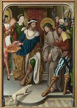 - Christ devant Pilate. Dans cette variation du thème, l'épouse de Ponce Pilate, Claudia Procula, est appuyée sur son épaule. La légende dit qu'elle croyait en l'innocence du Christ. Les mains du Christ et le chien sont pris d'une gravure de Schongauer.