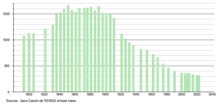L'évolution du nombre d'habitants est connue à travers les recensements de la population effectués dans la commune depuis 1793. Pour les communes de moins de 10 000 habitants, une enquête de recensement portant sur toute la population est réalisée tous les cinq ans, les populations de référence des années intermédiaires étant quant à elles estimées par interpolation ou extrapolation[20]. Pour la commune, le premier recensement exhaustif entrant dans le cadre du nouveau dispositif a été réalisé en 2004[21].