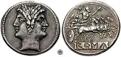 Qu'en est-il de la surprenante association entre le temps et la nef ? L'as d'airain, l'unité monétaire de Rome, est orné du Janus bifrons et d'une proue de navire. Jouer à pile ou face se dit capita aut navia? (« têtes ou nef ? »)[25]. Le navire n'est pas le seul revers de la pièce (voir illustration) ; et les autres monnaies romaines portent aussi une nef au revers (voir illustration). L'association iconologique entre le dieu et le navire est motivée par le concept de « passage » et de traversée du Tibre[26] et intimement liée à Portunus, le dieu des ports, alors que Janus est celui des portes[26]. Le Janiculum se trouve « au-delà du Tibre » par rapport au Capitole. le Tibre constituait une frontière naturelle de Rome avec l'Étrurie. De là la description ovidienne de Janus comme roi étrusque[26]. Cette association entre Janus et le passage du Tibre, explique l'érection, par Caius Duilius, d'un temple dédié à Janus, après sa victoire navale, la première que remportent les Romains, à la bataille de Mylae[26]. Ce temple a été inauguré le , le jour des Portunalia, fête de Portunus[26]. Pline note sèchement : « le poids réel de la livre de cuivre fut diminué durant la première guerre punique, la République ne pouvant faire face à ses dépenses ; et il fut décrété qu'on frapperait des as de deux onces. On gagna de la sorte cinq sixièmes, et on liquida les dettes. La marque de ces nouveaux as fut sur une face un Janus à deux faces, sur l'autre un éperon de navire. »