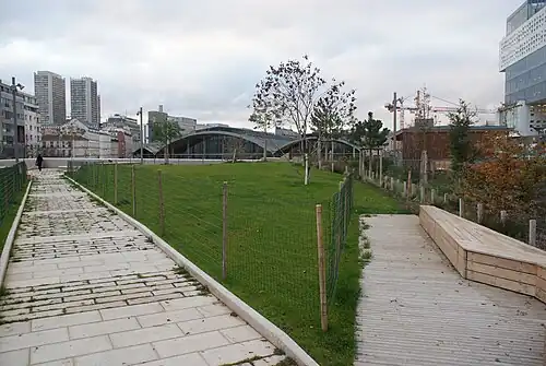 Le jardin a été planifié dans le cadre de l'opération Paris Rive Gauche. Cette opération d'urbanisme a pour objectif d'aménager une énorme partie du 13e arrondissement de Paris, tout au long du faisceau ferroviaire de la gare d'Austerlitz où le choix d'une couverture totale des voies ferrées a été retenu pour gagner du foncier et relier les deux « berges ferroviaires », auparavant déconnectées. Dans cette zone de jonction entre les anciens et le nouveau quartier, marquée par une différence de hauteur le long de la rue du Chevaleret, une « falaise » a été matérialisée et la rue Charcot a été prolongée par une pente douce ascendante vers le nouveau quartier et nommée rue Alphonse-Boudard. Les nouveaux immeubles sur dalle étant dépourvus de parkings souterrains, ceux-ci ont été regroupés dans cet espace triangulaire sur quatre sous-sols. L'espace au niveau de la rue a été réservé pour un nouveau gymnase et le toit, au « niveau rue » du nouveau quartier a été retenu pour un nouvel espace vert, en balcon au-dessus de la rue du Chevaleret et dans la continuité de la promenade Claude-Lévi-Strauss.