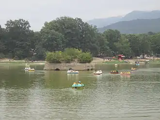Au milieu du réservoir se trouve une structure de briques en forme de chahar taqi. Reposant sur huit piliers latéraux et un pilier central, la structure de briques est entourée d'eau, donnant l'impression d'une île. À son sommet se trouvait un bâtiment de bois avec un toit couvert de céramiques. On y accédait, au nord, par un pont de bois dont seuls les piliers subsistent sous les eaux. L'eau du Sarcheshmeh était amenée par canalisation jusqu'au sommet du chahar taqi et se déversait dans le réservoir.