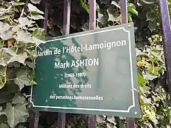 Le , le Conseil de Paris lui attribue la nouvelle dénomination « jardin de l’Hôtel-Lamoignon - Mark-Ashton », en mémoire de Mark Ashton (1960-1987), militant queer, fondateur de Lesbians and Gays Support the Miners[1],[2].