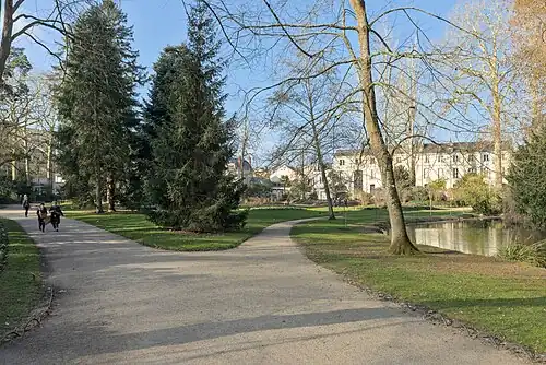 Conformément à la manière des Bühler, le parc se compose de grandes allées sinueuses dont l'une parcourt toujours le tour du jardin. Les arbres sont regroupés par essences, cèdres, platanes, séquoias géants et tilleuls qui forment des semblants de bois contrastant avec de vastes pelouses. Des cyprès chauves agrémentent l'île centrale (la présence d'un cours d'eau est traditionnelle dans les créations des Bühler).
