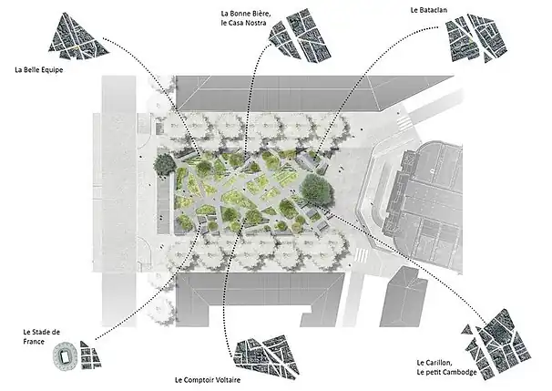 [article], sur Paris.fr, . - ↑ William de Lesseux, Adrien Toffolet, « Attentats du 13-Novembre : un jardin mémoriel verra le jour en 2025 à Paris, en souvenir des victimes »