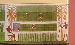 Le jardinage dans l'Égypte antique était un travail très dur ; les jardins nécessitaient une irrigation constante, avec de l'eau transportée ou soulevée à la main, le désherbage et l'entretien, y compris la propagation artificielle des palmiers dattiers, qui exigeait une grande habileté. De grands efforts étaient également nécessaires pour empêcher les oiseaux de manger les cultures. Des pièges ingénieux étaient installés pour attraper les oiseaux envahisseurs[2].