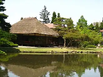 Le Rakujutei est un chalet destiné à la cérémonie du thé japonaise construit sur Naka shima ou « île du milieu ». Il dispose d'une alcôve et d'un toit chaumé. Les seigneurs féodaux et les dirigeants du clan y participaient aux cérémonies du thé.