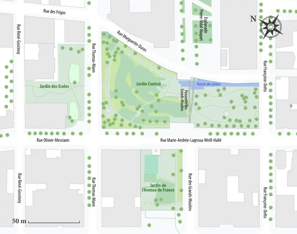D'une superficie de plus de 12 000 m2, l'ensemble comprend trois espaces différents : le « jardin de l'Avenue-de-France », le « jardin Central » et le « jardin des Écoles ».