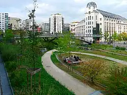 Une passerelle surplombe le jardin Central et permet de le traverser même pendant ses heures de fermeture, rejoignant ainsi directement la rue Marie-Andrée-Lagroua-Weill-Hallé et la rue Marguerite-Duras.