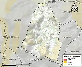 La commune est vulnérable au risque de mouvements de terrains constitué principalement du retrait-gonflement des sols argileux[30]. Cet aléa est susceptible d'engendrer des dommages importants aux bâtiments en cas d’alternance de périodes de sécheresse et de pluie. La totalité de la commune est en aléa faible (44,5 % au niveau départemental et 48,5 % au niveau national). Sur les 126 bâtiments dénombrés sur la commune en 2019, aucun n'est en aléa moyen ou fort, à comparer aux 75 % au niveau départemental et 54 % au niveau national. Une cartographie de l'exposition du territoire national au retrait gonflement des sols argileux est disponible sur le site du BRGM[31],[Carte 3].