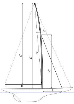 Ces conditions limites étant respectées, la voilure est jaugée en tenant compte d'un précintrage du mât, , qui sera ensuite interdit par la jauge. représente la hauteur du mât au-dessus de la bôme mise à l'horizontale, la longueur du mât de la bôme à sa tête (la corde d'un mât cintré), la longueur de la bôme. Ce qui donne la mesure de la grand-voile :