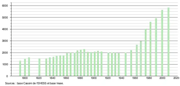 - ↑ Par convention dans Wikipédia, le principe a été retenu de n’afficher dans le tableau des recensements et le graphique, pour les populations légales postérieures à 1999, que les populations correspondant à une enquête exhaustive de recensement pour les communes de moins de 10 000 habitants, et que les populations des années 2006, 2011, 2016, etc. pour les communes de plus de 10 000 habitants, ainsi que la dernière population légale publiée par l’Insee pour l'ensemble des communes.