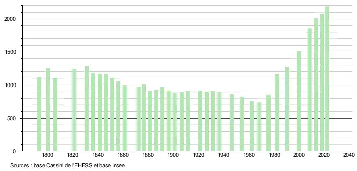 L'évolution du nombre d'habitants est connue à travers les recensements de la population effectués dans la commune depuis 1793. Pour les communes de moins de 10 000 habitants, une enquête de recensement portant sur toute la population est réalisée tous les cinq ans, les populations de référence des années intermédiaires étant quant à elles estimées par interpolation ou extrapolation[32]. Pour la commune, le premier recensement exhaustif entrant dans le cadre du nouveau dispositif a été réalisé en 2008[33].
