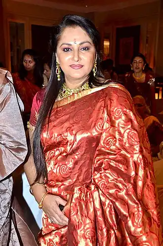 Jaya Prada (née Lalitha Rani le ) est une parlementaire et une actrice indienne. Surnommée la diva, elle est l'une des actrices les plus emblématiques et influentes des industries cinématographiques télougou et du cinéma indien, de la fin des années 1970, au début des années 1990[1]. Jaya Prada a reçu trois Filmfare Awards et a joué dans de nombreux films telougou et hindi ainsi que dans plusieurs films tamoul, malayalam, kannada, bengali et marathi. Elle quitte l'industrie cinématographique, au sommet de sa carrière, et rejoint le Telugu Desam Party (en) (TDP) en 1994 et entre en politique. Elle est membre du parlement (MP) de Rampur, de 2004 à 2014. Beaucoup la considèrent comme le plus beau visage du cinéma indien, à l'instar du maestro Satyajit Ray qui l'a qualifiée de « plus beau visage de l'écran indien »[2].