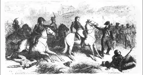 « Un aide de camp de Napoléon entra. Il apportait l'ordre à Girard et à sa division de marcher sur Fleurus pour faire sa jonction avec l'Empereur. Le général Girard qui était un des plus braves soldats de l'armée et qui avait été fort gai jusque-là, pâlit tellement en recevant cet ordre, que le Prince se retourna sur lui en lui demandant s'il se trouvait mal.