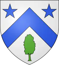 D’argent au chevron d’azur accompagné en chef de deux étoiles du même et en pointe d’un arbre de sinople[12].