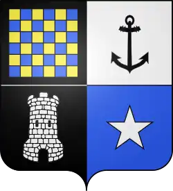 « Écartelé : au 1, du quartier des Comtes conseiller d'État de l'Empire ; au 2, d'argent à une ancre de sable ; au 3 de sable, à la tour d'argent; au 4 d'azur, à l'étoile d'argent.[3]
