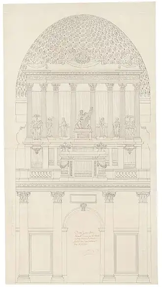 - Salle de bal provisoire de l'ambassadeur d'Autriche, Paris (6e arrondissement), jardins du Petit Luxembourg, 1770 (détruit) : À l'occasion du mariage du Dauphin et de l'archiduchesse Marie-Antoinette, Chalgrin construisit pour le comte de Mercy-Argenteau, ambassadeur d'Autriche, une sorte de basilique, similaire à celle que Victor Louis édifia, pour la même occasion, pour le compte de l'ambassadeur d'Espagne. « Extérieurement, la nudité du volume, encore inhabituelle, étonna le grand public ; mais, parmi les invités, le succès fut considérable. Dans son Journal, le duc de Croÿ signale le balcon qui régnait autour de la salle : "au tiers de la hauteur des colonnes, qui paraissaient pourtant presque isolées, il y avait un grand jubé garni de monde qui faisait bien et d'où le coup d'œil fut superbe. Nous y soupâmes quatre-vingt-dix personnes à une table de cent couverts."[18] De son côté, Mercy-Argenteau écrit : "le jour de mon bal, il est entré en tout six mille masques quoique je n'eusse fait distribuer que quatre mille cinq cents billets." Marie-Thérèse demanda des copies des dessins de Chalgrin ; une aquarelle est conservée au Louvre. Il existe aussi des estampes de F.-M.-A. Boizot. Blondel cite l'œuvre dans son Cours ; plus tard, à l'occasion du congrès de Vienne, Metternich en fit exécuter une réplique exacte (A.-Ch. Gruber). »[19]