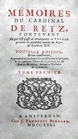 Le cardinal de Retz reste connu pour ses Mémoires, rédigés entre 1675 et 1677[5] et publiés seulement en 1717, soit quarante ans après leur rédaction. Le sous-titre en est :