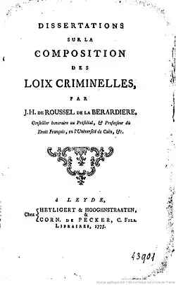 - Dissertation sur la composition des loix criminelles, par J.-H. de Roussel de La Bérardière,..., Leyde, Heyligert et Hoogenstraaten, 1775.