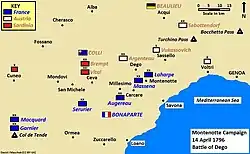 Nommé à la division Laharpe le , il prend part à la victoire de Montenotte le [2]. Les troupes françaises convergent ensuite sur Dego : dans l'après-midi du 13, le général Masséna constate que la prise de cette localité ne sera pas facile car les positions austro-piémontaises sont bien fortifiées et pourvues de 18 canons ; les défenseurs, quant à eux, sont au nombre de 3 000[9]. Dès le lendemain matin, à 11 h, le commandant français lance toutefois en avant la division Meynier, formée en deux colonnes, pour s'emparer de Dego. À droite, le général Colaud de La Salcette déploie 1 800 hommes tandis qu'au centre, Masséna conduit personnellement les 14e et 32e demi-brigades de ligne, dont l'effectif combiné se monte à 2 600 hommes. Sur la gauche, la division du général Laharpe se porte sur la rive ouest de la Bormida et met six canons en batterie afin de soutenir l'attaque[10].