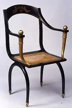 Le meuble en question en acajou plaqué se compose de deux corps superposés, d'inégale profondeur, à poignées latérales portantes: le corps supérieur, moins profond, est en forme d'armoire dont le vantail est remplacé par un rideau de « lattes mouvantes » verticales, en acajou, collées sur une toile grise et coulissant horizontalement en s'enroulant vers la droite. Le corps inférieur est fait d'une partie mobile qui se tire vers l'avant, à l'aide d'un grand anneau de cuivre doré passé dans la gueule d'un lion, coulissant dans un cadre fixe orné de deux gaines sommées de têtes féminines en bronze patiné. Remarquons qu'à leur base ne se voient aucuns pieds nus et cette absence se remarque aussi sur les lits et les tables de nuit sortis de l'atelier de Chapuis à cette époque. De part et d'autre du rideau de lattes, on note d'élégantes incrustations d'ébène et de citronnier représentant un arc à la corde détendue traversé par un flèche. Selon sa coutume à cette période de sa production, Chapuis pose sur le champ du plateau supérieur, comme sur celui de l'abattant, une étroite incrustation de bois noirci entourée de fins filets de cuivre. La raideur du meuble et sa décoration, qu'elles soient généralisées, comme les gaines à visages, ou propres à Chapuis, comme les incrustations à filets de cuivre ou autres, permettent d'en fixer la date : Consulat ou début de l'Empire (1799-1810). Le soin de son exécution incite donc à le ranger dans la catégorie des « chaises de garde-robe ».