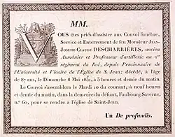 - ↑ L'ami de la religion, Journal ecclésiastique - Notice sur M. l'Abbé Descharrières, 1831 - Pages 337 à 341