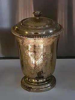 Le musée des arts décoratifs de Strasbourg conserve une autre pièce liée à l'histoire locale, un gobelet à couvercle en argent doré, de forme tulipe, orné d'une frise de lambrequins. La corporation des drapiers l'offrit à Jean Dietrich (1651-1740)[8] et Marie Barbe Kniebs (1665-1747) à l'occasion de leurs noces d'or célébrées le 15 décembre 1731. Leurs armes d'alliance sont gravées sur la frise[3].