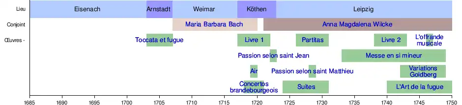 Weimar (1703), Arnstadt (1703–1707), Mühlhausen (1707–1708), Weimar (1708–1717), Köthen (1717–1723), Leipzig (1723–1750) |