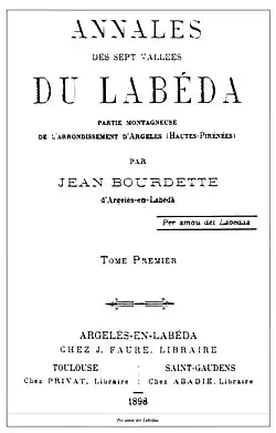 - Annales des Sept Vallées du Labédà. "Per amou det Labédà". Tome I. Un volume, 1898, 528 pp, 14x22,5 cm. In 8°.