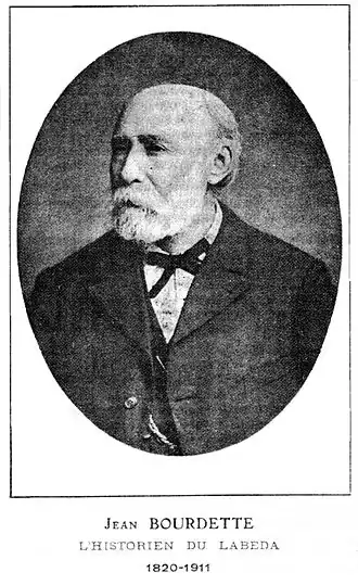 - ↑ Louis CANET : L'homme et l'œuvre. Jean Bourdette historien du Labéda (1818-1911) avec en additif le texte du discours prononcé sur la tombe de Jean Bourdette le 2 octobre 1911 par M. de Roquette-Buisson. Tarbes,1912, Imprimerie Lesbordes.
