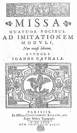 - A esté agréé une messe en musicque composée par Maistre Jean Cathala Maistre de musicque en l'Eglise d'Auxerre et excellant joueur de cornet à bouquin intitulée Inclina cor meum deus, présentée de sa part en recognoissance du don qui lui fust faict par ce chapitre le trente juin dernier à cause de son assistance à la feste de Sainct Pierre à laquelle il joua dudict cornet. Laquelle messe a esté remise es mains de Me Jacques Michel Maistre de musique de ceste eglise pour la faire chanter au premier jour.