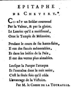 | Chevalier de Saint-Louis,Seigneur du Choysel, Écuyer de Son Altesse Sérénissime la Princesse de Condé, Aide-de-camp, Capitaine des Gardes de S.A.S, Gentilhomme, Mgr le Prince de Condé, Maitre de Camp de Cavalerie, Membre de la Société Patriotique de Bretagne, Membre des académies de Dijon, Nancy, Metz et Lyon, Directeur en chef des fortifications de Bretagne, Commandant de Sarraguemines, Gouverneur de Poutrelles, Brigadier des Armées du Roi, Lieutenant de la ville d'Auxonne, |