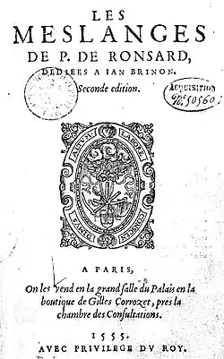- Pierre de Ronsard. Les Meslanges de P. de Ronsard, dédiées à Jan Brinon. Seconde édition. Paris : Gilles Corrozet, 1555. 8°, 106 p.