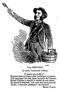 Jean Sarrazin se mit alors à vendre ses poèmes en même temps qu’il vendait ses olives. Cette sorte de vente directe assura l’essentiel de la distribution de son œuvre. Les vers faisaient-ils mieux gouter les olives ou celles-ci ajoutaient-elles quelques saveurs à la poésie ? Toujours est-il que les consommateurs lyonnais prirent l’habitude de consommer cumulativement les deux produits. Cette pratique pour le moins inhabituelle lui valut le surnom de « poète aux olives ».