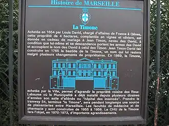 « Achetée en 1654 par Louis David, chargé d’affaires de France à Gênes, cette propriété de 4 hectares, complantée en vignes et oliviers, est donnée en cadeau de mariage à Jean Timon, neveu des David, à condition que lui-même et sa descendance portent les armes des David et accouplent le nom des David à celui des Timon. Jean Timon-David fait construire en 1765 la bastide de la Timone, un nom qui lui restera malgré plusieurs changements de propriétaires. En 1869, la Timone, achetée par la ville, permet d’agrandir la propriété voisine des Roux-Labaume où la municipalité a déjà installé depuis plusieurs dizaines d’années son asile d’aliénés ou « hôpital des insensés ». Prendre le tramway 54, jusqu'au terminus « la Timone », sera pendant longtemps une source de plaisanteries entre Marseillais. Les facultés de médecine et de pharmacie y sont construites de 1955 à 1958. Le CHU de la Timone fait l’objet, en 1970-1973, d’importants agrandissements. »