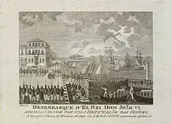 Pendant un mois, Salvador célèbre la présence de la cour en son sein. Les autorités municipales cherchent à séduire le régent afin de le persuader d'établir le siège de son royaume dans la ville et vont jusqu'à lui proposer d'y construire un luxueux palais pour accueillir la famille royale. Cependant, Jean décline cette offre et fait connaître aux habitants sa volonté de s'installer à Rio de Janeiro. La cour reprend donc sa route et arrive dans la baie de Guanabara le . À Rio, le régent retrouve son épouse, ses filles et d'autres membres de sa suite, dont les navires ont été séparés de son escadre pendant le voyage et qui sont arrivés à destination avant lui. Le , toute la cour débarque finalement dans la capitale du Brésil. Le régent et son entourage découvrent alors une ville entièrement décorée pour recevoir la famille royale et des festivités sont organisées en son honneur durant neuf jours[30].