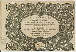 - IIe livre d'airs à 4 parties. - Paris : Robert III Ballard, 1655. 5 vol. 8° obl. RISM C 283, Guillo 2003 n° 1655-I.