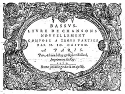 - ↑ Second livre de chansons, madrigalz et motetz à trois parties (Paris, 1580).