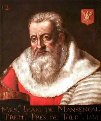 "Si l'influence du clergé féodal de Bazas a préparé, disions-nous, un pape à l’Église en la personne de Bertrand de Goth, notre magistrature locale a formé, d'autre part, un Premier Président qui a illustré le Parlement de Toulouse pendant les guerres civiles du XVIe siècle. Je veux parler de Jean de Mansencal, né à Bazas, fils d'un lieutenant-civil de notre Présidial, et mort à Toulouse en 1563[2]. Comparer Mansencal au chandelier Michel de l'Hôpital, ne serait pas un excès d'honneur pour notre magistrat bazadais. Au hasard, prenons dans sa vie une anecdote qui mette en relief l'indépendance de son caractère et le respect dont il entourait sa haute profession : Le Prince de Condé, nommé Gouverneur de Languedoc, faisait son entrée à Toulouse. Mansencal fut invité à lui présenter ses devoirs. C'était déroger à la coutume d'après laquelle le Gouverneur était tenu de devancer le Premier Président. Mais, en l'espèce, le Gouverneur étant prince de sang, paraissait avoir droit à des égards exceptionnels. Mansencal refusa d'innover et se retrancha derrière les prérogatives de sa charge. Le Parlement et la suite du Prince négocièrent, mais sans résultat. Enfin, un expédient fut imaginé : Le Gouverneur et le Premier Président sortiraient chacun de leur hôtel à la même heure, avec leur escorte, et se rencontrant sur la place publique se diraient l'un à l'autre : "Monsieur, j'allais chez vous." Ainsi, le litige était tranché en fait, sans qu'on eut touché au principe. Le portrait de Mansencal orne aujourd'hui la chambre dorée de la cour d'appel de Toulouse, mais à Bazas son nom même est oublié."