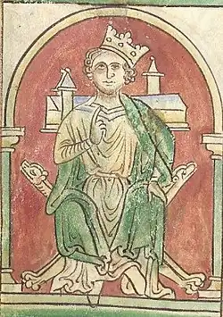 Jean, extrait d'une miniature de l'Historia Anglorum de Matthieu Paris, vers 1250-1255. Il tient dans sa main gauche l'abbaye de Beaulieu, dont il est le fondateur. | |