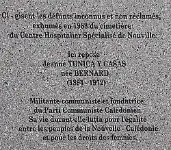 Jeanne Tunica est une femme politique française, née à Graissessac (Hérault) le et morte à Nouville (Nouvelle-Calédonie) le [1],[2]. Cofondatrice du Parti communiste calédonien, elle relaie les revendications sociales et politiques des Kanaks et des travailleurs vietnamiens de Nouvelle-Calédonie dans l'immédiat après-guerre. Forcée de s'exiler en raison des pressions politiques qu'elle subit, elle finira sa vie dans l'oubli.