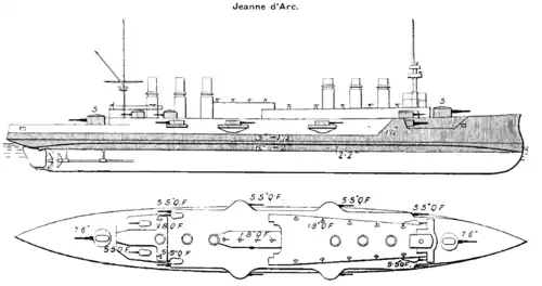 Le croiseur cuirassé Jeanne d'Arc, construit en 1895 d'après les plans de Louis-Émile Bertin, fut à son époque le plus grand et plus puissant bâtiment de la marine française. Il fut lancé en 1902 du chantier naval du Mourillon à Toulon. Son blindage de ceinture, de passerelles et tourelles était de 150 mm.