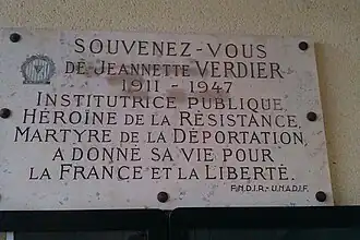 Jeannette Verdier s’engage dans la Résistance avec son époux, l'école servant de lieu de rassemblement aux membres du réseau Étienne-Leblanc (Pierre Charié) coordonné par l'homme d'affaires et journaliste britannique Maurice Buckmaster. Tous deux hébergent à l'été 1944 l'opératrice radio Lilian Rolfe, connue sous le nom de « Claudie » pour les résistants français et agente du Special Operations Executive[3],[4].