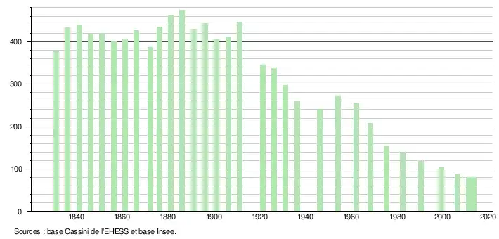 L'évolution du nombre d'habitants est connue à travers les recensements de la population effectués dans la commune depuis 1831. À partir du , les populations légales des communes sont publiées annuellement dans le cadre d'un recensement qui repose désormais sur une collecte d'information annuelle, concernant successivement tous les territoires communaux au cours d'une période de cinq ans. Pour les communes de moins de 10 000 habitants, une enquête de recensement portant sur toute la population est réalisée tous les cinq ans, les populations légales des années intermédiaires étant quant à elles estimées par interpolation ou extrapolation[9]. Pour la commune, le premier recensement exhaustif entrant dans le cadre du nouveau dispositif a été réalisé en 2006[10],[Note 1].