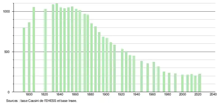 L'évolution du nombre d'habitants est connue à travers les recensements de la population effectués dans la commune depuis 1793. Pour les communes de moins de 10 000 habitants, une enquête de recensement portant sur toute la population est réalisée tous les cinq ans, les populations de référence des années intermédiaires étant quant à elles estimées par interpolation ou extrapolation[28]. Pour la commune, le premier recensement exhaustif entrant dans le cadre du nouveau dispositif a été réalisé en 2006[29].