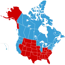 vote populaire lors de l'élection fédérale canadienne de 2006, par province et territoire. À l'opposé de la convention américaine récente, le schéma bleu/rouge est inversé.