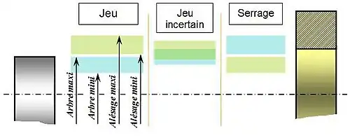 - avec jeu incertain: toutes les combinaisons n'aboutissent pas forcément à un jeu de même signe. Ce cas peut poser des soucis lors de l'assemblage à la chaîne. On utilise rarement ce cas, seulement pour des couvercles.