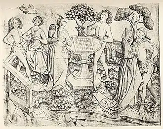 - L'amour, comme le jeu d'échecs, nécessite une partenaire, c'est pourquoi il est souvent associé au jeu d'échecs. Les représentations de femmes dans le traité Le Livre des jeux, commandé par Alphonse X le Sage et achevé en 1283, reflète précisément cette tendance. Les parties d'échecs apparaissent souvent comme des métaphores de l'amour courtois. Vers la fin du XVe siècle, trois manuscrits de Robinet Testard sont consacrés à une telle interprétation allégorique du jeu d'échecs. Le manuscrit le plus connu est intitulé Le livre des échecs amoureux moralisés, et est créé pour la comtesse Louise de Savoie. L'ouvrage se présente comme un commentaire en prose du poème Les Échecs de l'amour d'Évrard de Conty, créé à la fin du XIVe siècle, illustré par Robinet Testard. Ses destinataires, Charles d'Angoulème et Louise de Savoie, étaient de grands connaisseurs des échecs et possédaient toute une bibliothèque de traités sur le thème des échecs[30].